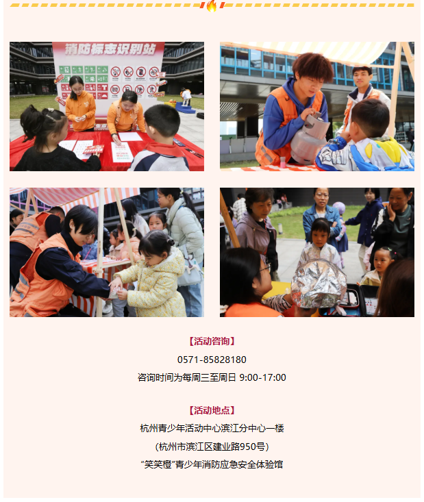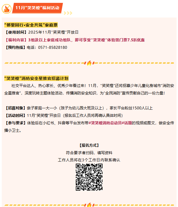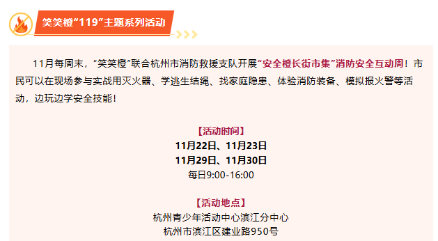 11月,“笑笑橙”青少年消防应急安全体验馆联合杭州市消防救援支队开展一系列消防安全主题活动,提升杭城市民消防安全知识与自护自救能力,为建设平安社会与青少年平安成长保驾护航。
