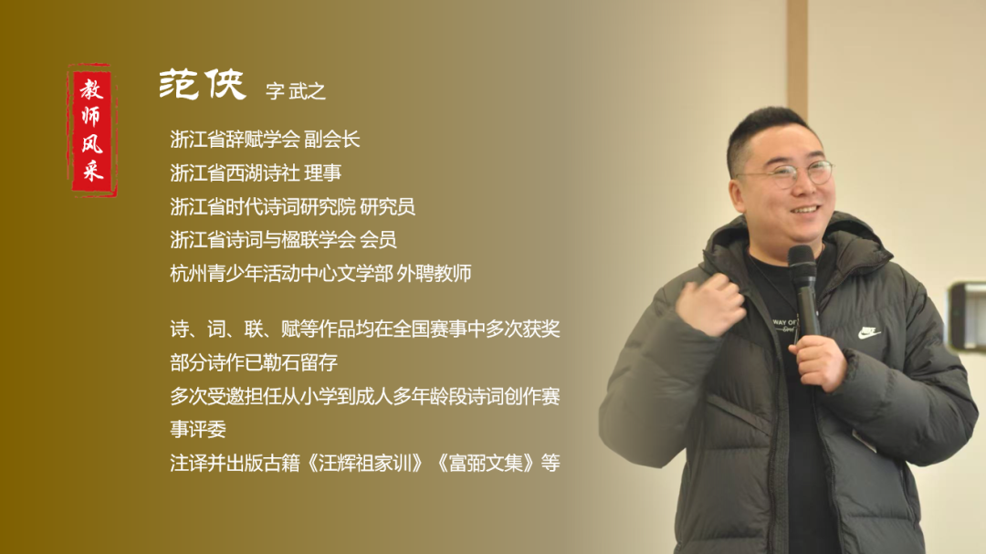 范侠老师深耕诗词文化领域多年,拥有深厚的专业素养与人文底蕴,现任杭州青少年活动中心外聘讲师、浙江省辞赋学会副会长、浙江省时代诗词研究院研究员、浙江省西湖诗社理事、浙江省诗词与辞赋学会会员。