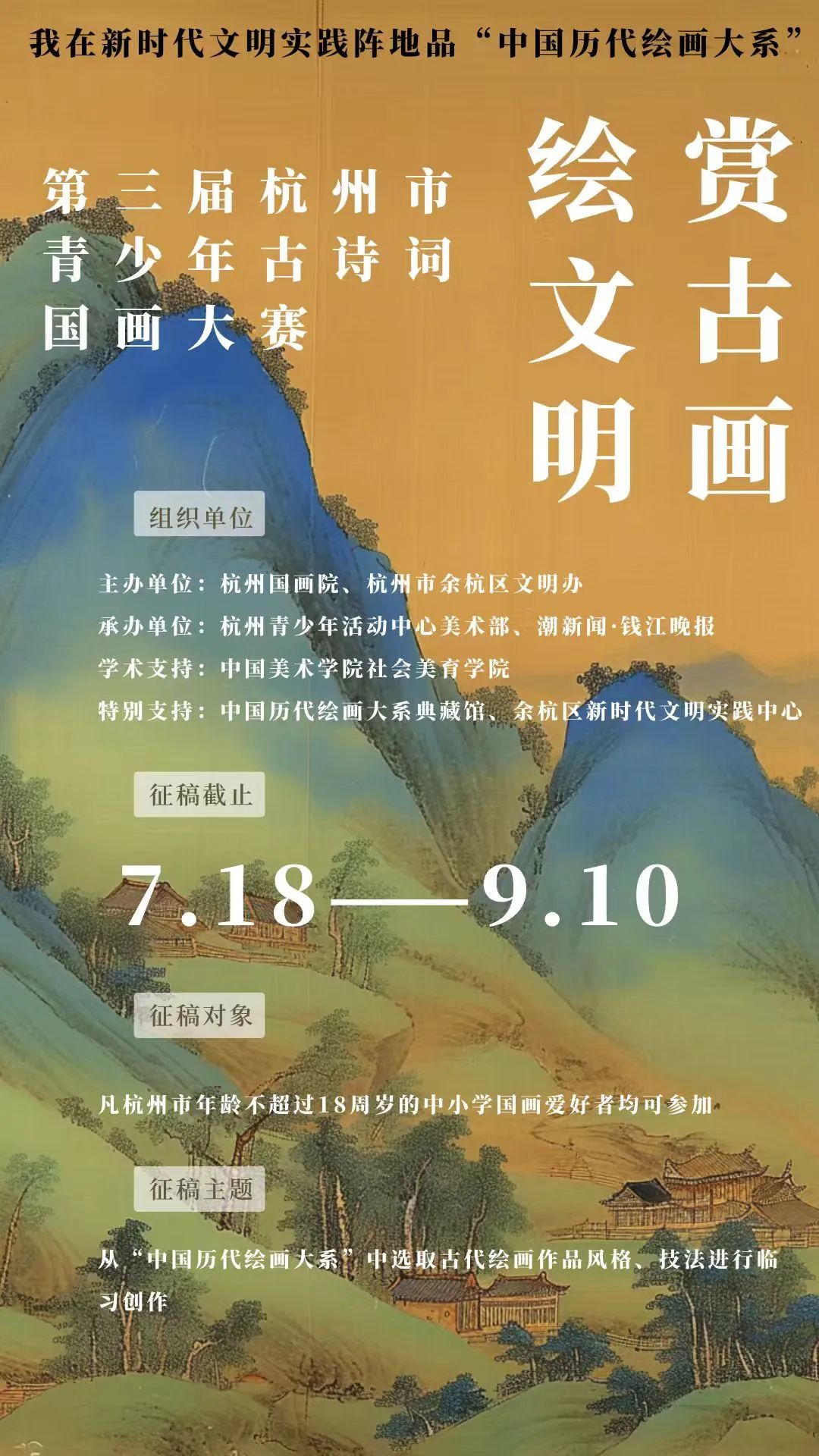 为进一步加强未成年人思想道德建设、传承和弘扬中华民族优秀传统文化,充分发挥新时代文明实践中心(所站)等阵地服务和育人功能,让青少年在传统国画艺术中汲取养分、感受古代绘画的魅力,特举办“我在新时代文明实践阵地品‘中国历代绘画大系’”暨“赏古画 绘文明”第三届杭州市青少年古诗词国画大赛。