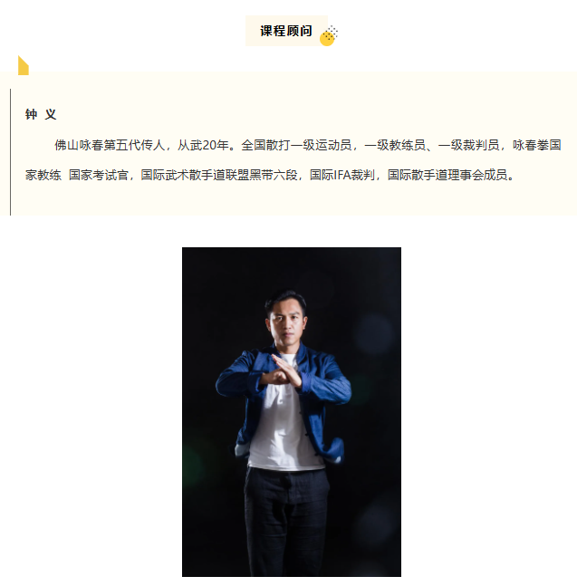 课程通过学习咏春拳基础动作,掌握基本防身技能和攻防技术,提高运动技能,提高注意力和应变能力,培养坚韧品质,传承武术文化精神。