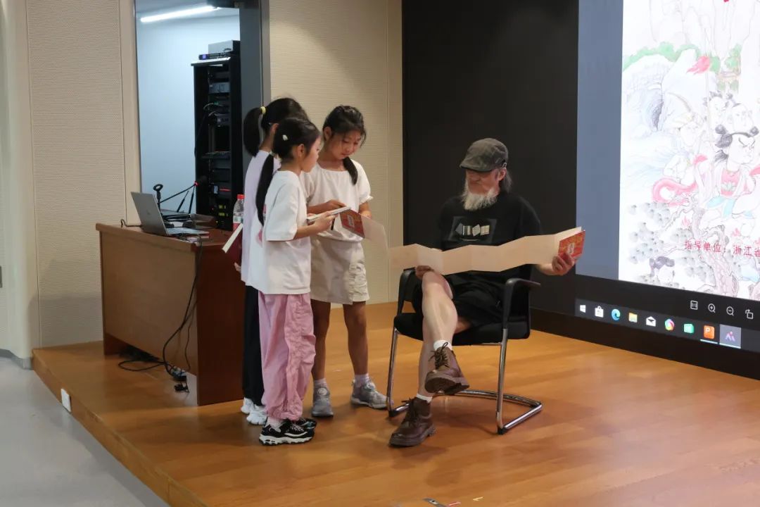 分享会后,现场气氛达到了高潮!来自浙江省漫协少儿专委会的小漫画家们和中心美术部的优秀学员们,迫不及待地与宓老师、钱老师展开了热烈的互动交流。孩子们提出了各种天马行空又充满童真的问题,宓老师都耐心细致、风趣幽默地一一解答。