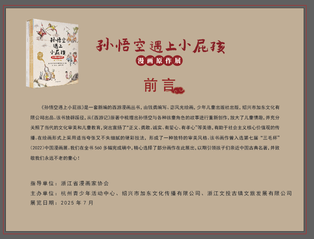 7月,《孙悟空遇上小屁孩》展览在杭州青少年活动中心美术楼一楼持续展出。宓风光老师以其标志性的彩铅漫画风格,将神通广大的孙悟空与古灵精怪的当代孩子置于同一画面,上演了一幕幕令人捧腹又发人深省的“跨次元”互动。展览不仅展示了丰富的原稿作品,更通过巧妙的场景布置,让观众仿佛置身于这个奇幻的故事之中,吸引了众多孩子和家长驻足欣赏,流连忘返。