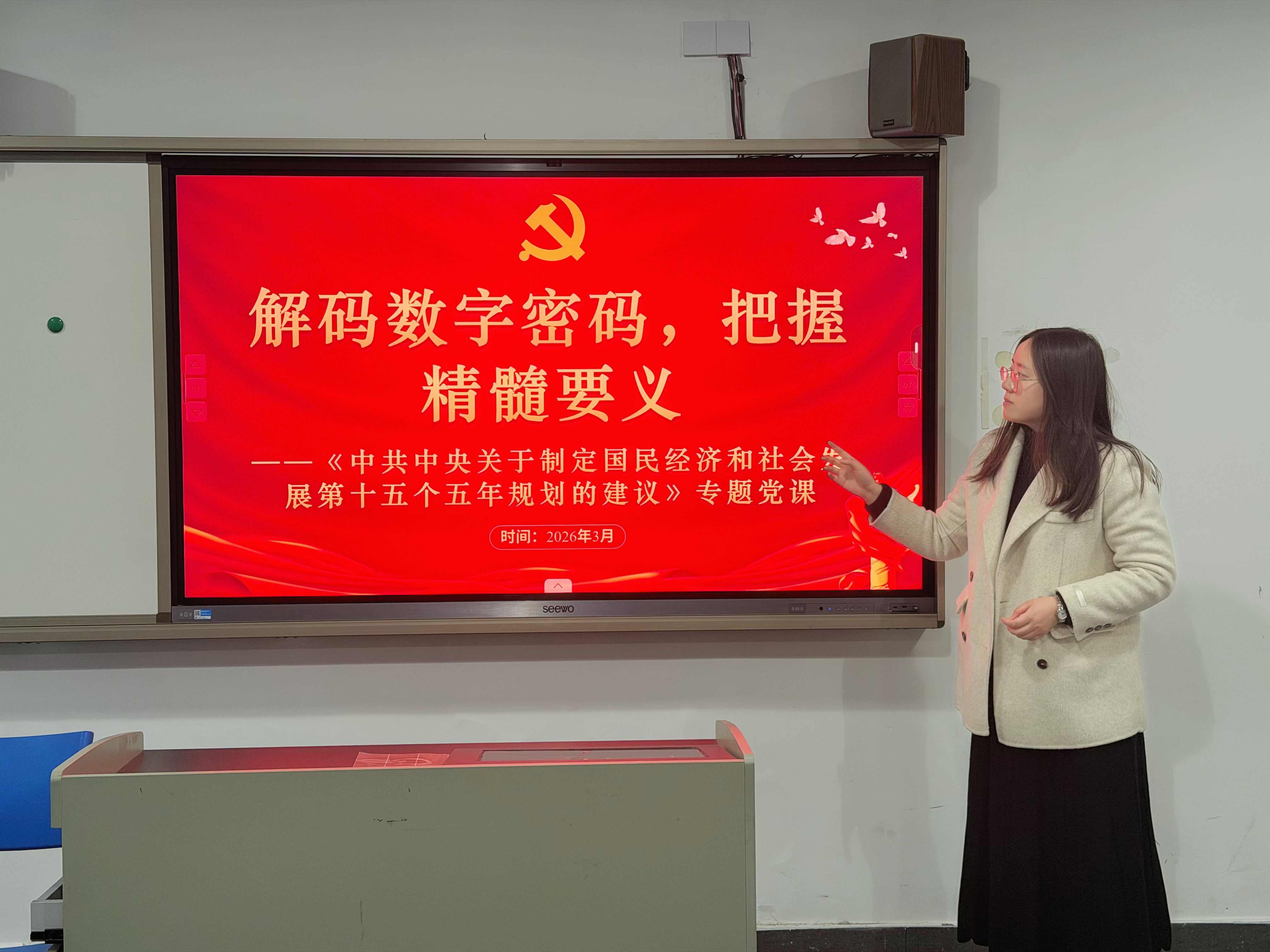 接下来,支部组织宣传委员罗佳敏给与会党员上了一堂题为《解码数字密码,把握精髓要义》的专题党课。党课主要从“为何学习《中共中央关于制定国民经济和社会发展第十五个五年规划的建议》(以下简称《建议》)”“如何解读数字密码155356112124”“怎样落实《建议》”这三个方面展开详细讲述。