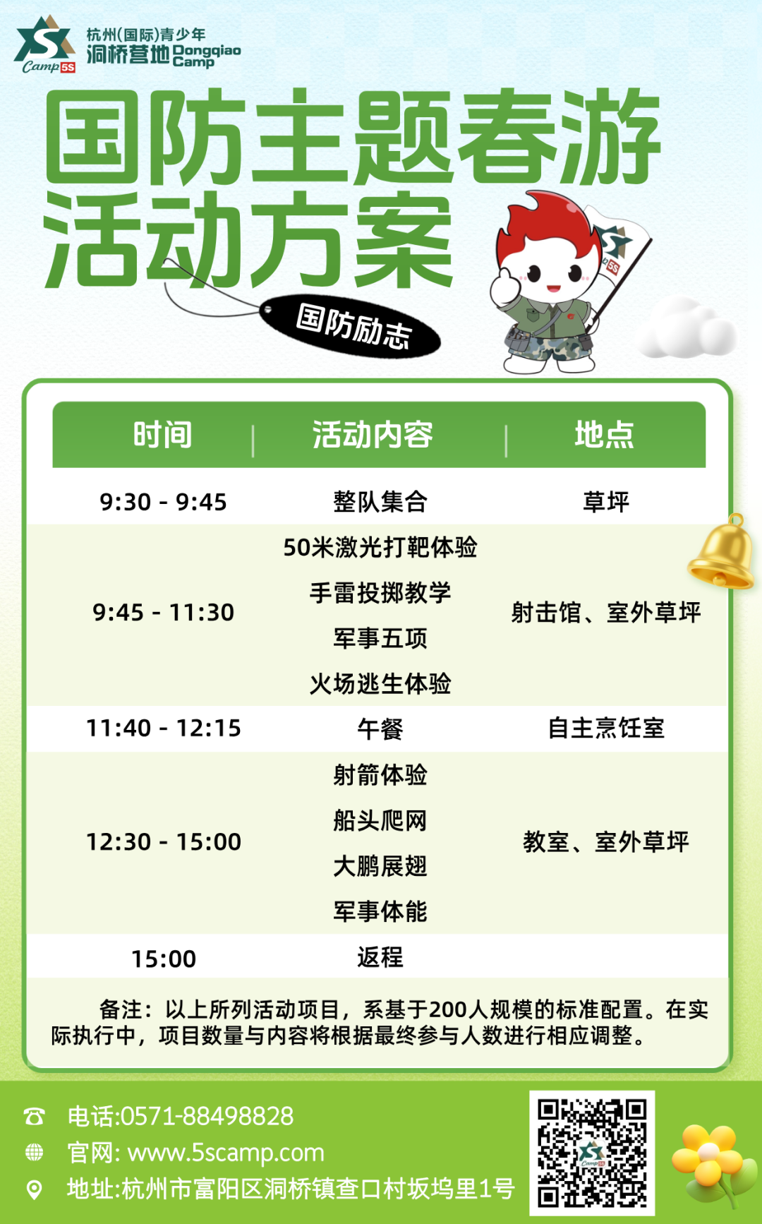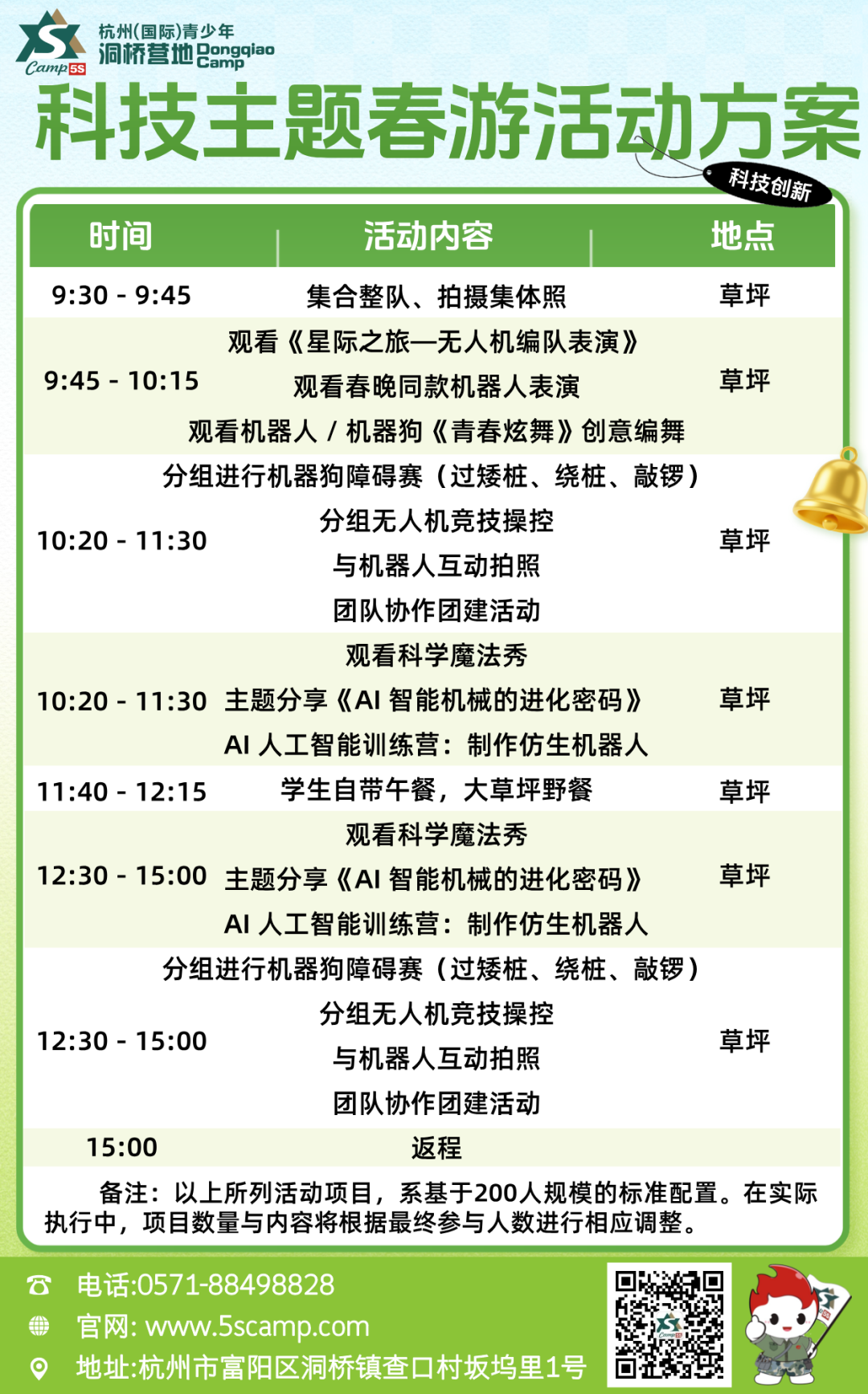 营地2026年春游活动开始预约,我们可根据不同需求定制个性化、专业化、一站式的活动,让学员们在沉浸式体验环境中突破自我、挑战自我、超越自我。赶快加入我们,让我们一起见证学员们的成长与蜕变。