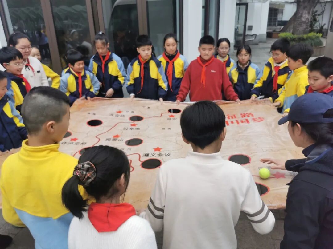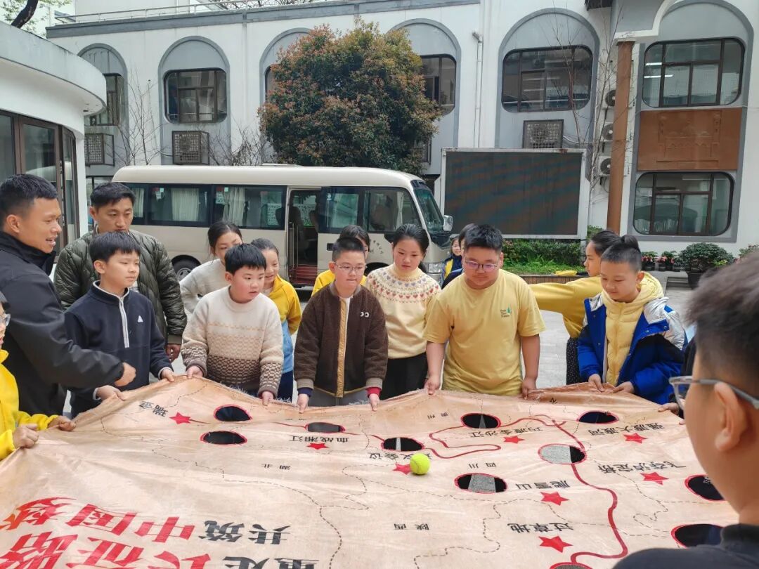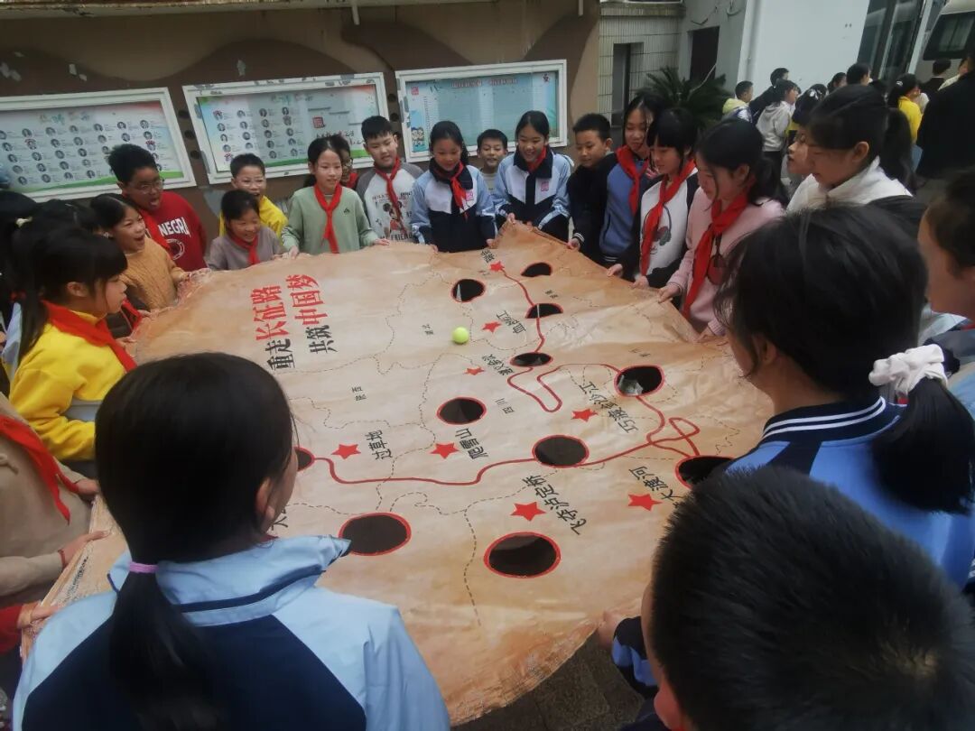 五年级学生分批开展沉浸式“重走长征路”团康活动。通过模拟“飞夺泸定桥”“爬雪山过草地”等长征经典场景,引导孩子们在团队协作中体验革命先辈的艰辛与坚韧。孩子们手挽手、肩并肩,在挑战中感悟长征精神的伟大,在互助中凝聚团队力量。