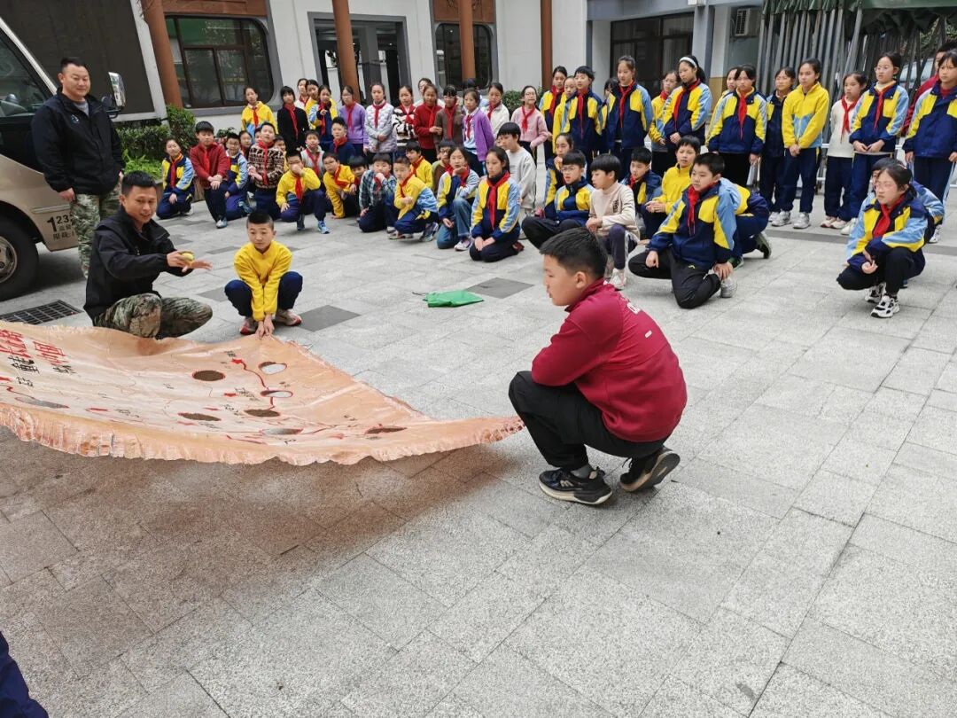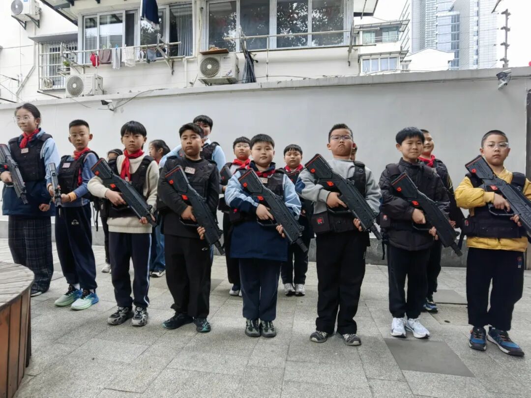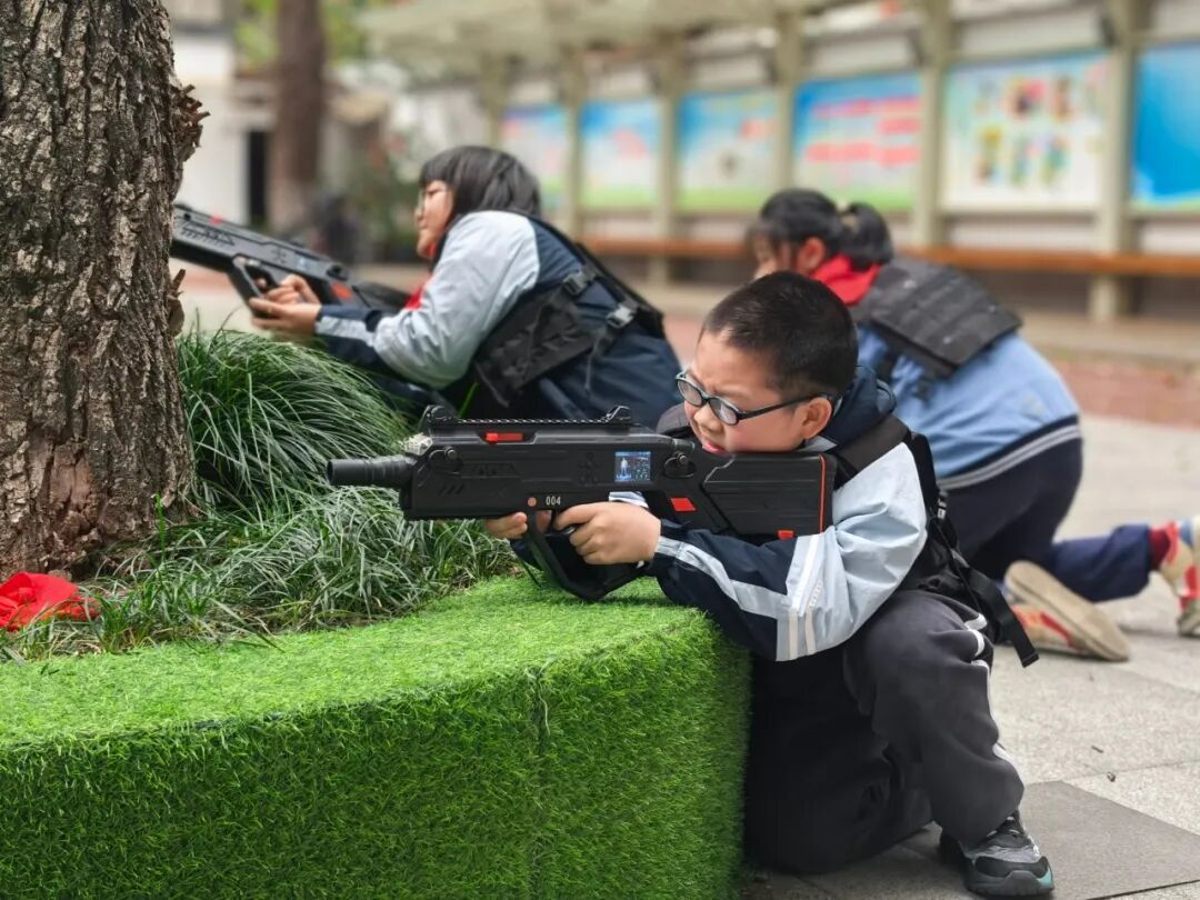 教官们将校园中的花园打造为“野战战场”,组织开展真人CS对抗赛。四年级学生在教官的专业指导下,身着装备,分红蓝两队展开激烈角逐。掩体后敏捷穿梭、战术手势默契配合、团队协同精准出击……通过实战对抗教学,帮助孩子们在体验中锻炼反应速度与战略思维,深刻理解“团结就是力量”的内涵。