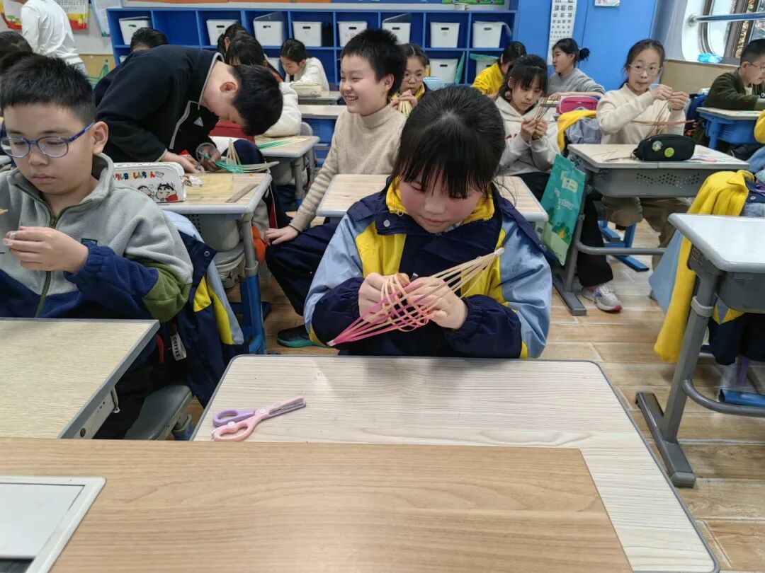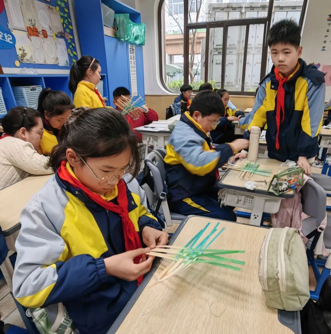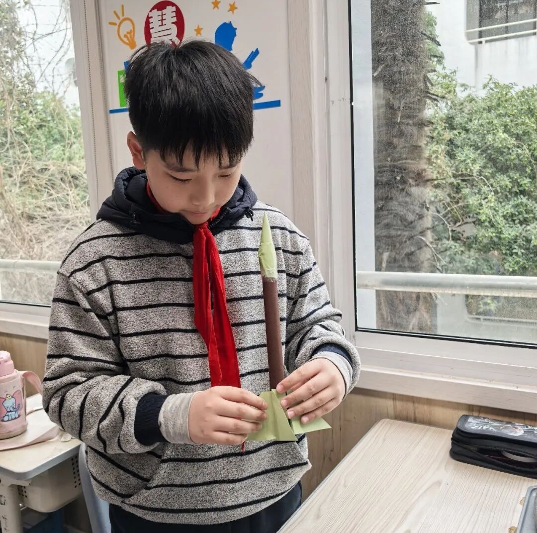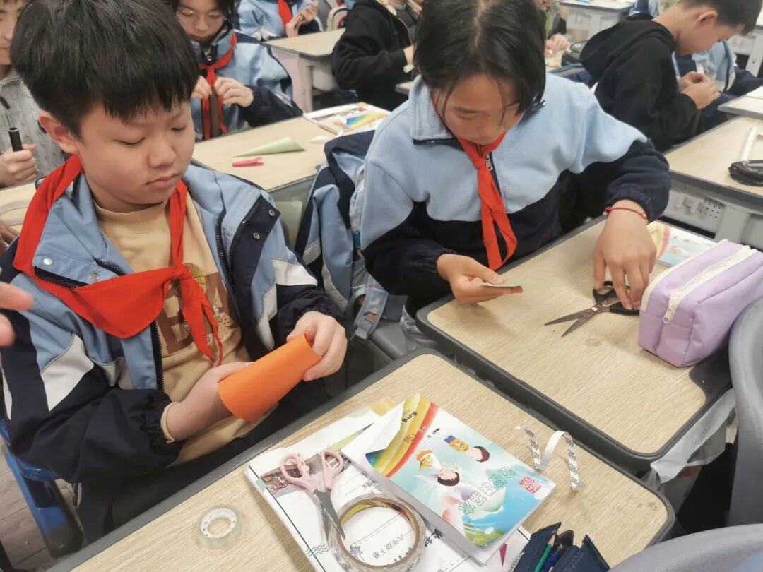 教室内,五年级各班开展“小竹船——红船制作”手工活动。在教官的细致讲解和示范下,一根根竹条在孩子们手中变成了精致的小红船。教官们一边指导制作,一边讲述“红船故事”,帮助孩子们感悟开天辟地、敢为人先的首创精神。