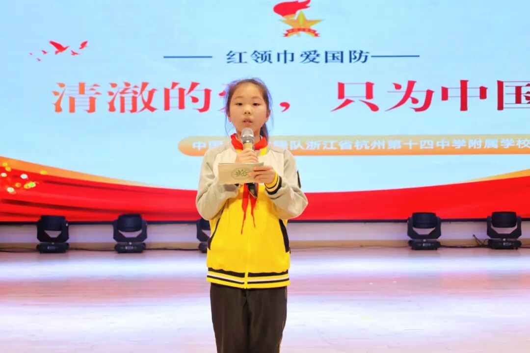 在“思想升华”环节,少先队员代表陈澄同学率先发言,她表示将从身边、从小事做起,认真学习知识,强健体魄,遵守纪律,爱护集体,把爱国的种子藏在心里,让它慢慢生根发芽。随后,杭十四中附校党总支书记、少工委主任吴金鹤紧扣活动主题进行总结升华,希望少先队员们牢记今日感悟,将“清澈的爱,只为中国”刻在心中,传承红色基因、锤炼过硬本领,长大后既能守护好我们的祖国,也能为世界和平贡献中国少年的力量,让和平之花绽放在世界的每一个角落。