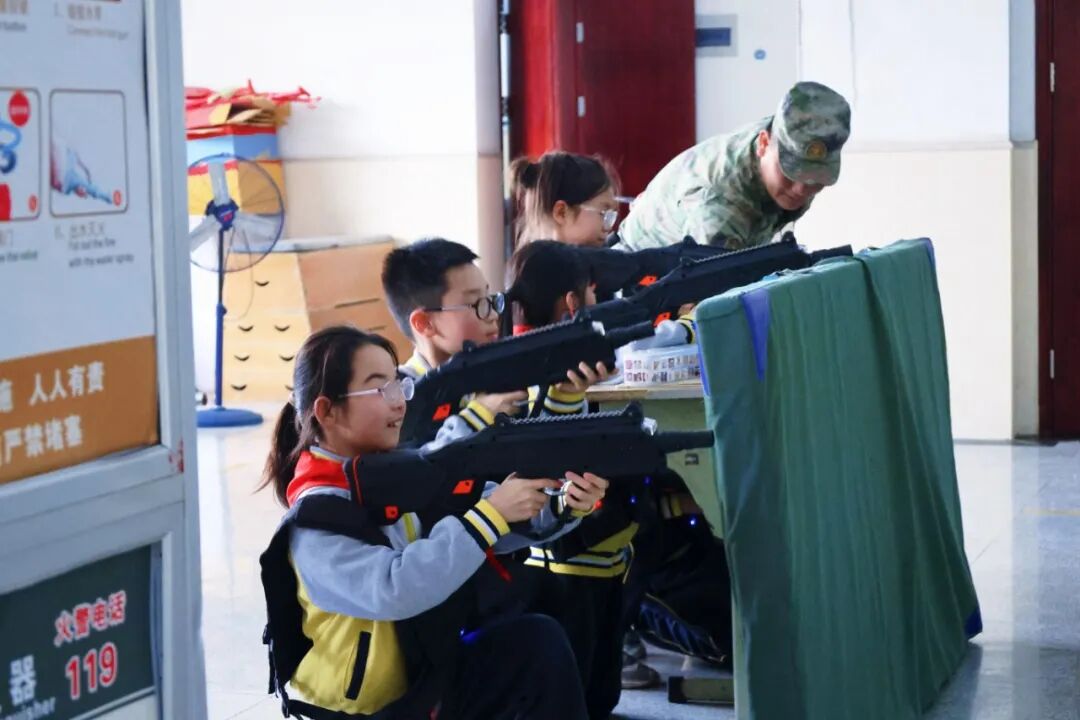 在“实践淬炼”环节,营地教官们组织学生分别开展应用射击、战场救护、真人CS、军事体能、手雷投掷等7项国防教育体验项目。在教官们的耐心指导下,少先队员们认真学习握枪姿势、瞄准技巧、包扎技能等,将抽象的爱国情怀转化为具体的行动感知,进一步强化了“强国必有我”的信念。