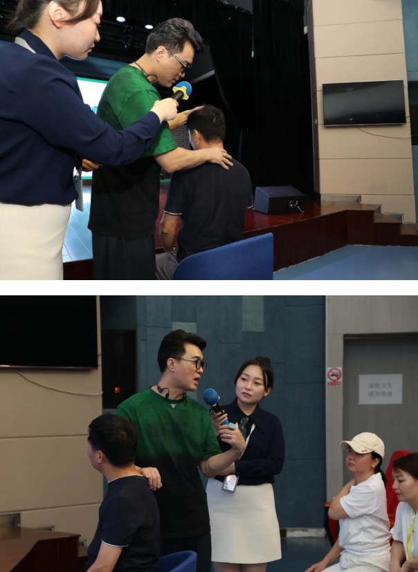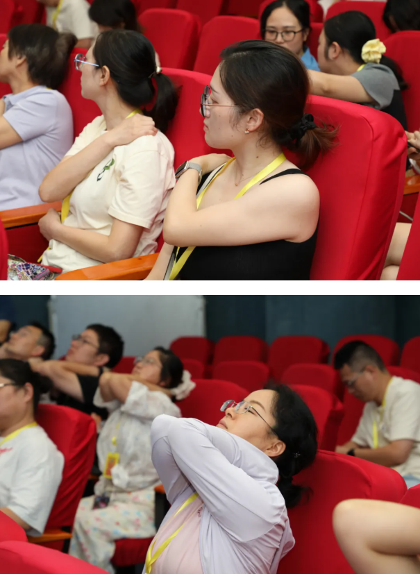 在讲座互动环节中,孙嘉诚老师特别邀请肩颈不适的观众上台体验调理,多位家长踊跃响应。通过按摩穴位,并配合颈部旋转导引动作,短短两分钟就让体验者当场感叹 “肩膀瞬间松弛下来,头也不沉了”,现场直观展现了中医经络调理的即时效果。