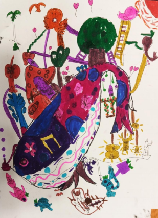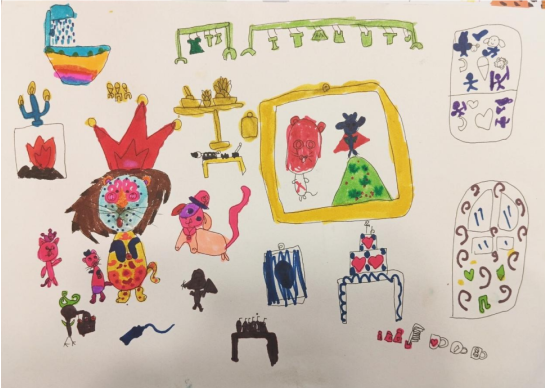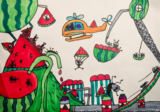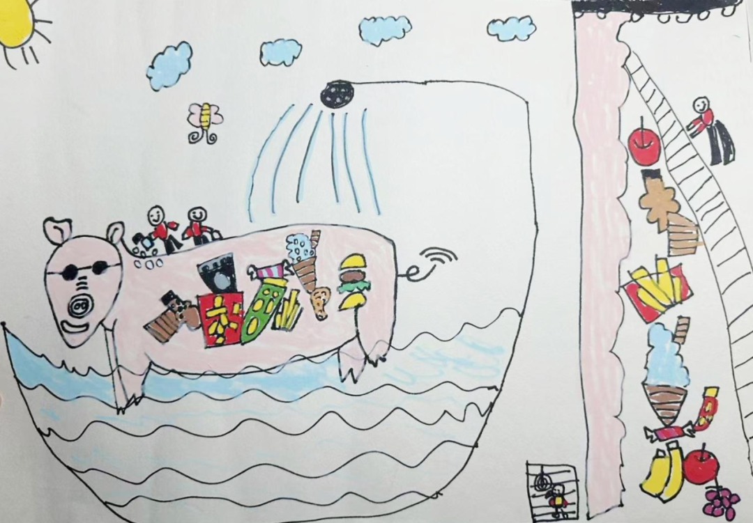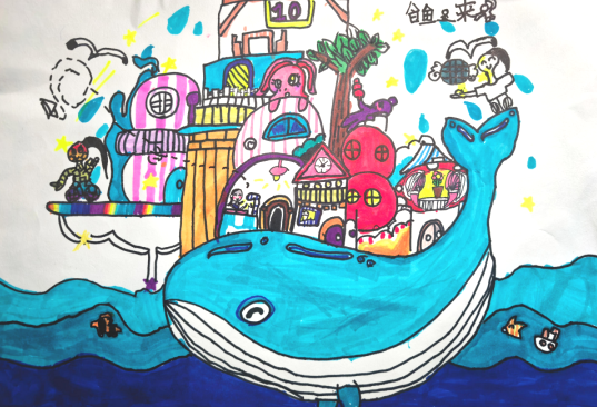 蒋同学的想象力很丰富,绘画语言比较自由流畅,稍稍缺一点耐心,可以从鼓励她慢慢涂色,精心完成一件作品开始培养她的耐心。