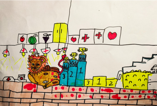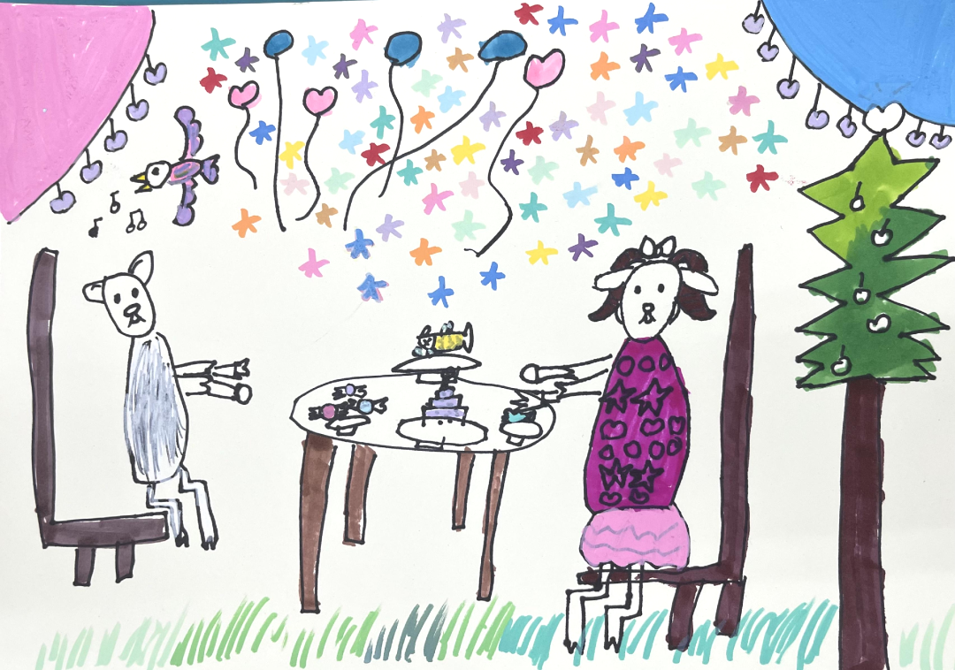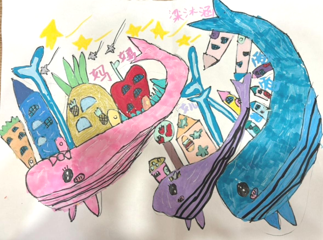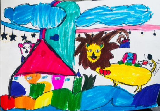 梁同学,比较有自己的观点和想法,喜欢运用颜色进行绘画,颜色绘画不容易刻画细节和细致的内容,这个阶段培养细致的观察很重要,多鼓励她画一些细节的内容。