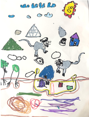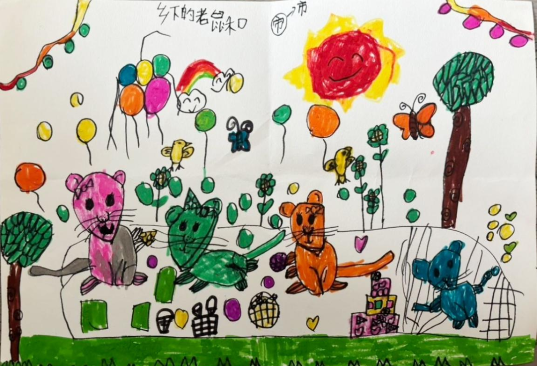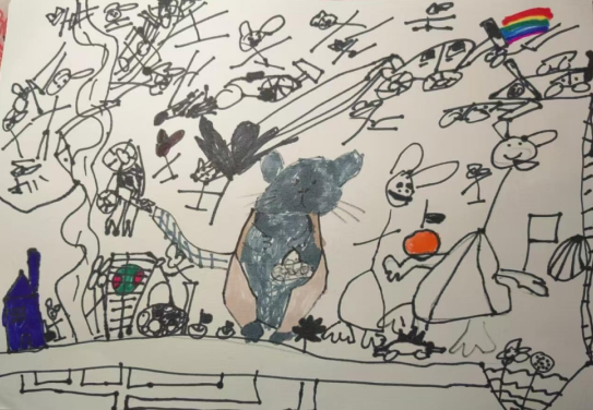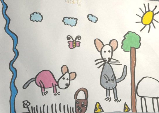 我画的是一只老鼠的故事,今天小老鼠带了很多东西给另外两个小老鼠吃。一个小老鼠在削皮,削完皮它用他用嘴巴尝一尝,很甜的,叫这只老鼠一起吃。那两只老鼠在打球,可是有一个车子开过来把气球弄破了,很多老鼠都要跳到蹦床里面,这里一个老鼠在开车,一个老鼠正在飞翔,然后有两个车子比赛,这个车子赢了。这时候彩虹出现了……