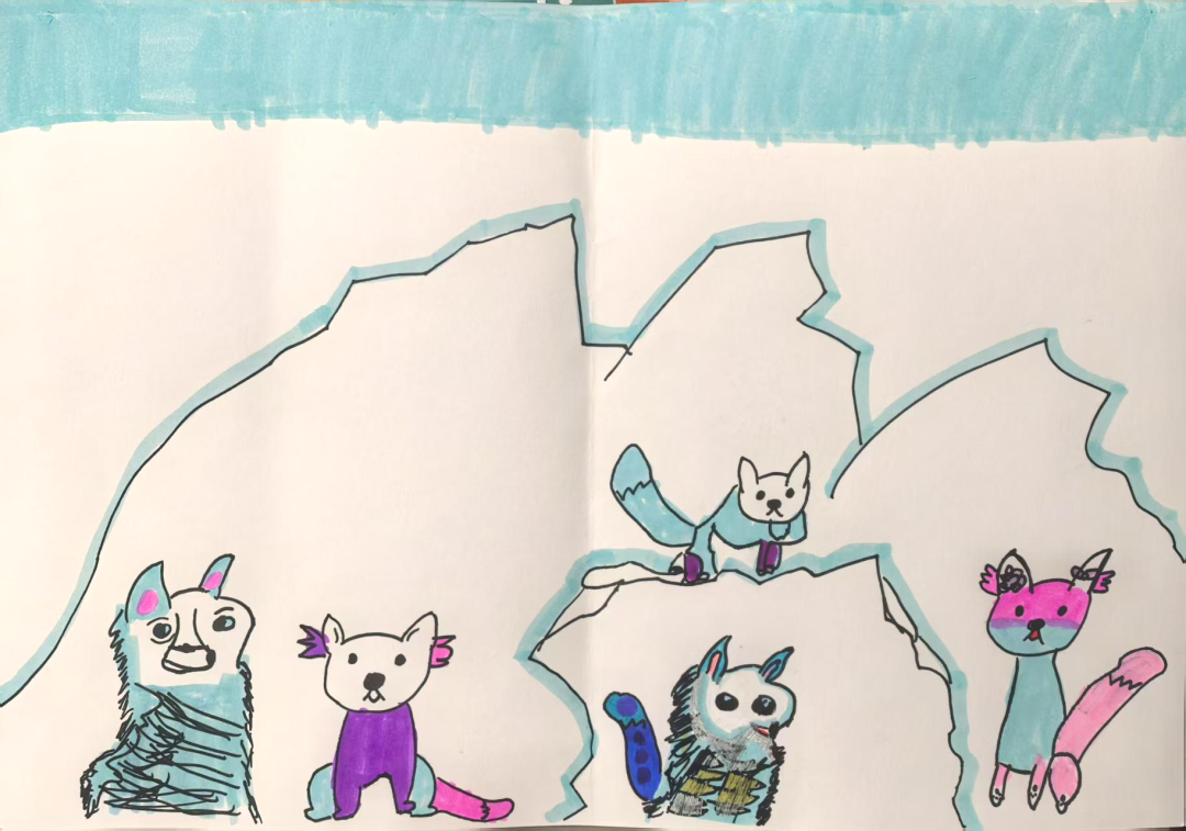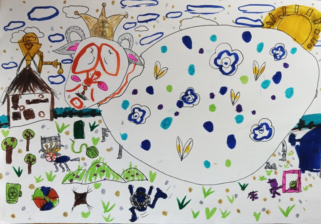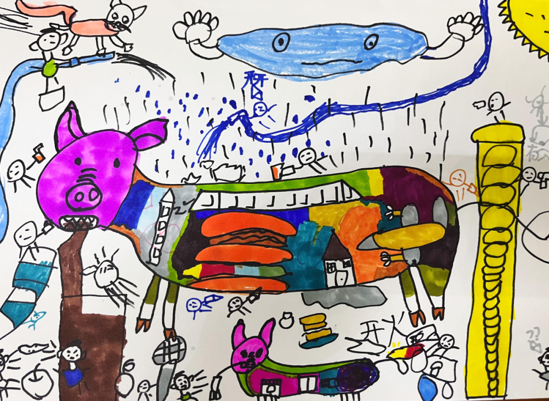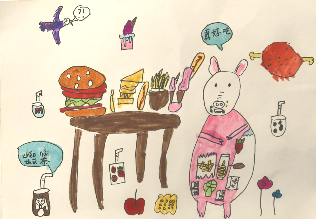 孟同学,有天马行空的想象力,画的速度很快,表现在画面里会把形象简单处理一笔带过,以后在家画画的时候让他慢下来。