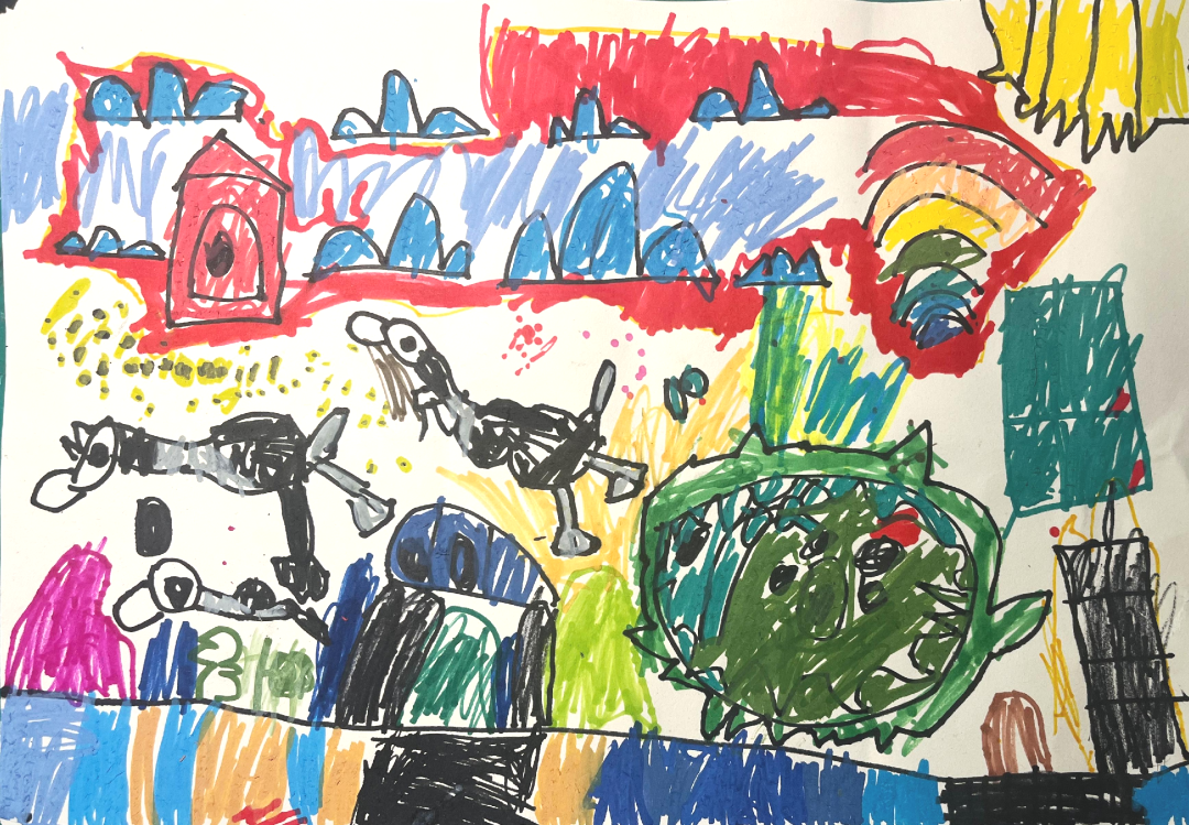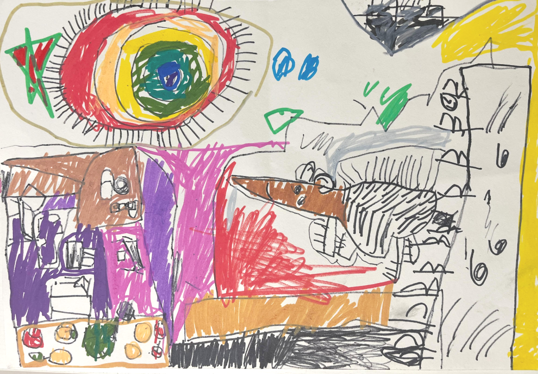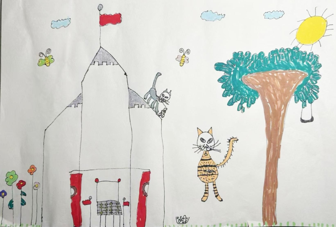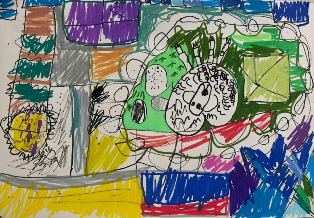 逸哲同学第一次上课的时候画画喜欢模仿照抄,后来通过隐藏示范图片,鼓励他自己进行表达,他也开始融入更多的记忆和想象中的内容,画面内容也是越来越丰富。目前阶段尽量避免让他照样画。