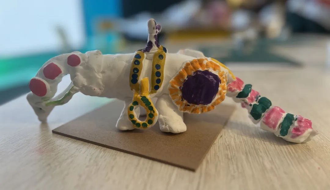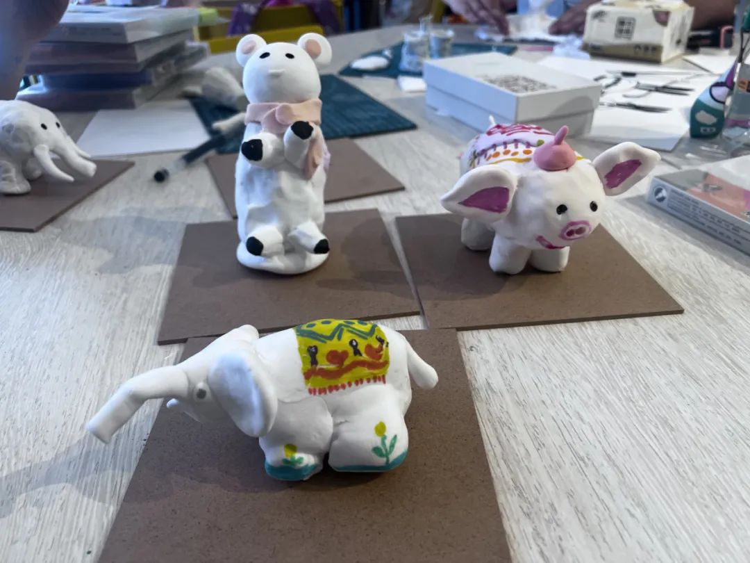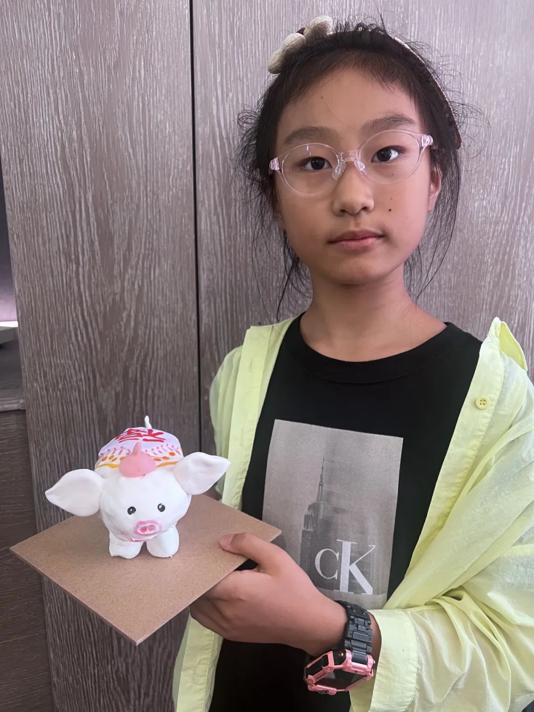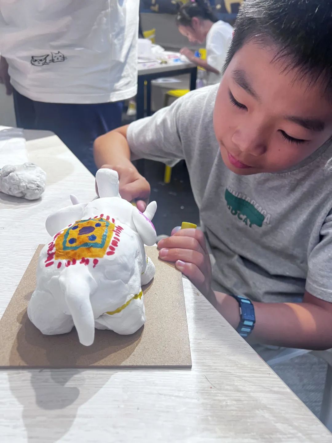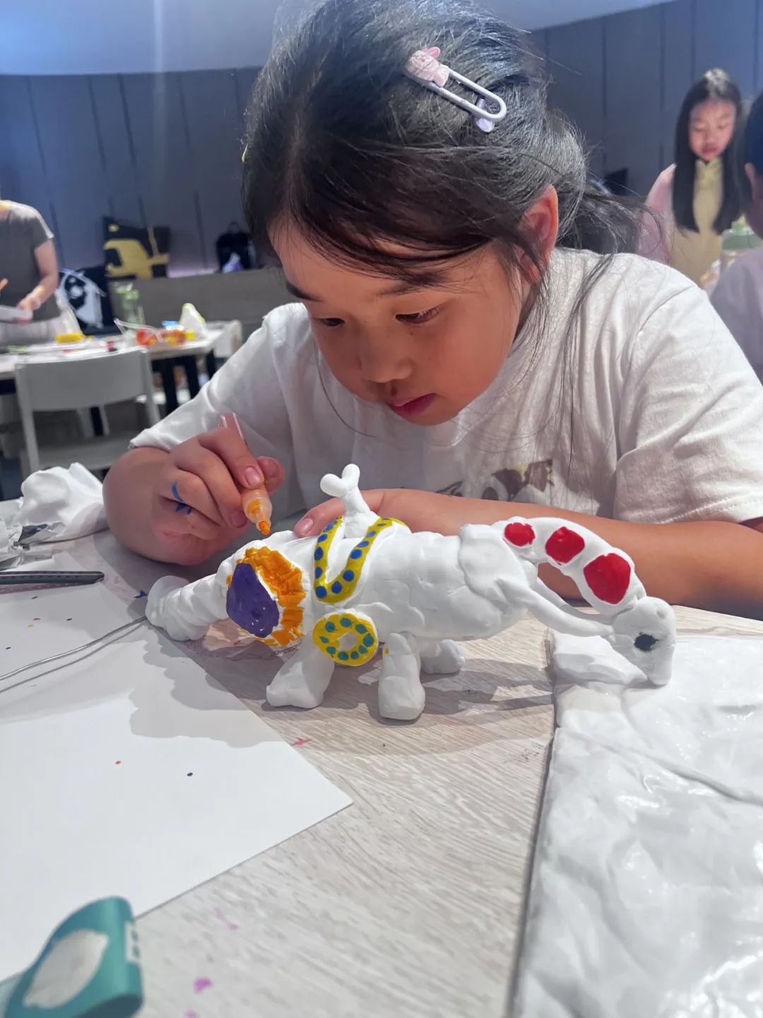 “立体的动物世界”里,孩子们成了小小雕塑家。他们趴在韩美林先生的动物雕塑前,认真观察青铜的冷硬、陶瓷的温润如何塑造动物的神态;回到工作台,又拿起黏土,捏出威风的大象、胖嘟嘟的熊猫、圆滚滚的猪,俊俏的马。从“怎么让四肢立起来”到“如何用材料表现形态”,再到色彩的装饰,孩子们在摸索中理解“立体”的奥秘,感受从平面构想转化为立体作品的奇妙过程。
