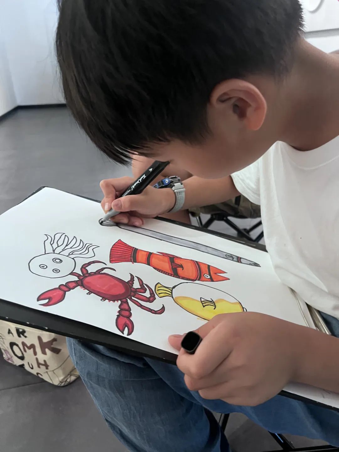 在“传统纹样的魅力”课堂上,孩子们可不是简单临摹。他们跟着老师追溯龙纹、云纹、鱼纹里的千年故事,从韩美林先生的作品里找灵感,把神话传说、自然观察揉进画笔。有人给传统鱼纹加了“彩虹鳞片”,有人让龙纹缠绕上现代几何线条,那些曾出现在古画、青铜器上的纹样,在孩子们笔下变成了会“讲故事”的新创作。原来专业的纹样知识,能这样有趣地扎根在心里,让古老的纹样在画纸上“活”过来。