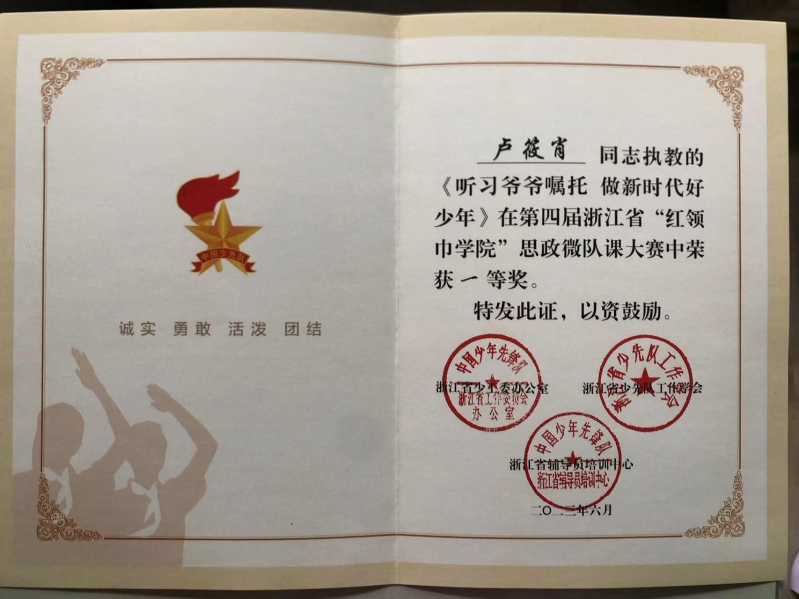 其中,文学部大队辅导员卢筱肖的思政微队课《听习爷爷嘱托 做新时代好少年》被推荐参加第四届浙江省“红领巾学院”思政微队课决赛,最终斩获浙江省一等奖,同时荣获“最佳展示奖”,在颁奖仪式上展示并面向全省进行线上直播。本次大赛以“学习二十大,争做好队员”为主题,共收到1148件初赛作品,34名选手进入决赛。《听习爷爷嘱托 做新时代好少年》一课娓娓讲述习爷爷关心关爱少年儿童的生动故事,带领少先队员们探寻习近平总书记的足迹,感受习爷爷对少年儿童的真挚关怀和殷切希望,引导少先队员牢记习爷爷的嘱托,做一个祖国和人民需要的新时代好少年。卢筱肖老师发表获奖感言,“作为校外辅导员,应该发挥资源优势,结合自身特点,让更多形式活泼、内容丰富的队课走进少先队员的心中。”