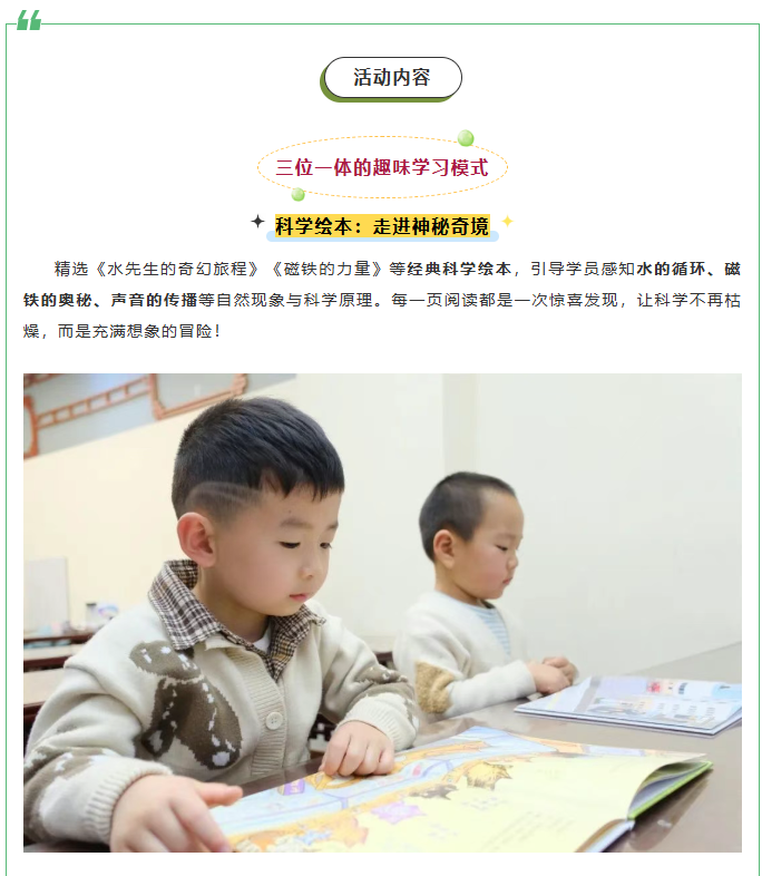 科学绘本+实验课堂:通过生动有趣的绘本故事,带孩子走进科学世界,再通过动手实验,将知识变为现实!