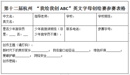 3)现场作品递交或邮寄方式:请将参赛表(见下图)格粘贴于作品后并递交至杭州市昭庆寺里街道22号杭州青少年活动中心外语楼107办公室。联系人:叶老师 85821126;18868764584。