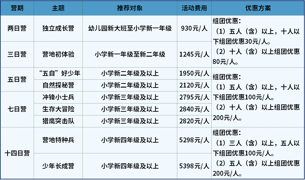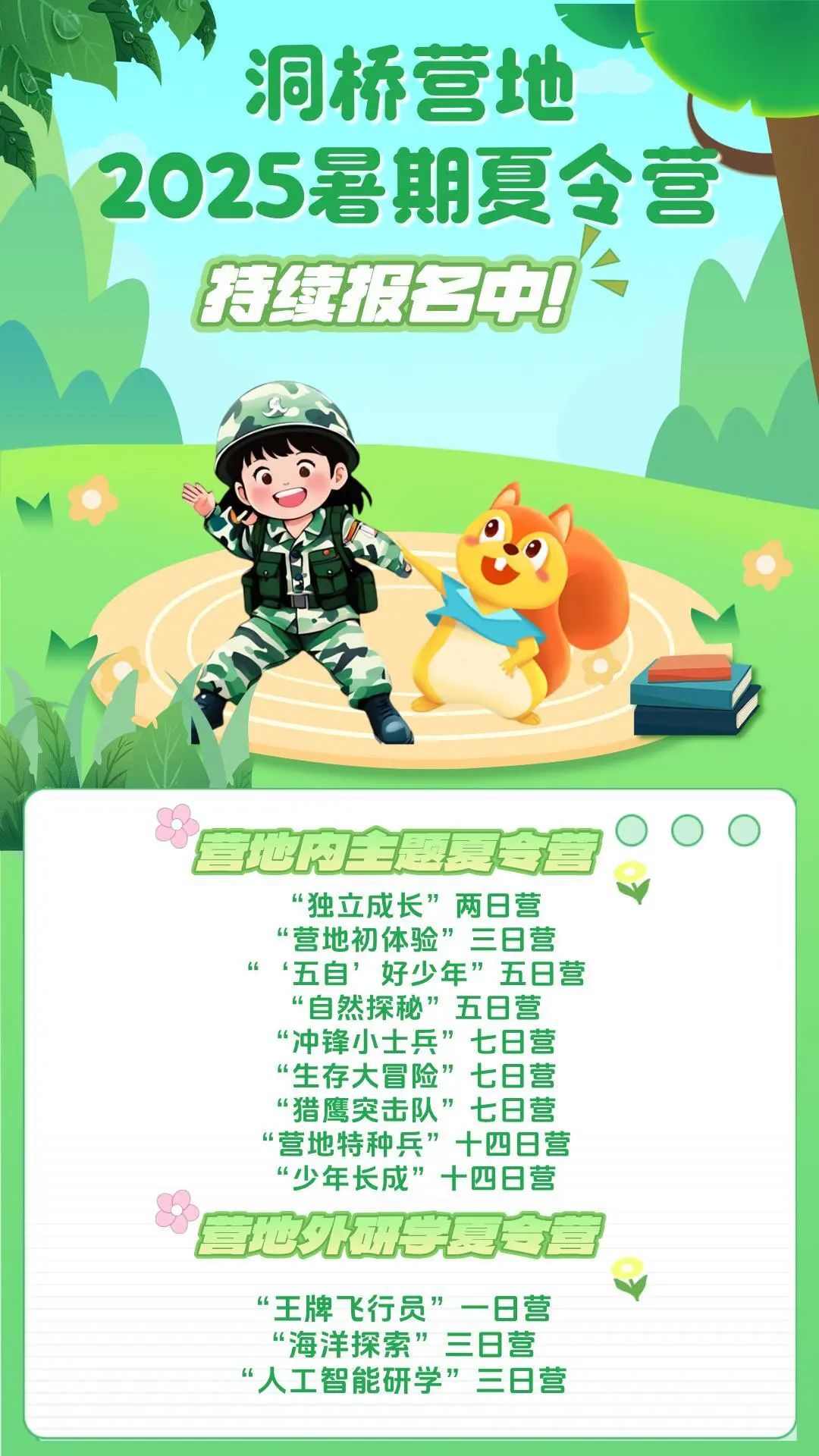 洞桥营地特推出两日“独立成长营”;三日“营地初体验”;五日“‘五自’好少年”“自然探秘营”;七日“冲锋小士兵”“生存大冒险”“猎鹰突击队”;十四日“营地特种兵”“少年长成营”等九大主题营,活动内容更丰富、形式更新颖、保障更完善,让孩子们在成长中收获快乐!