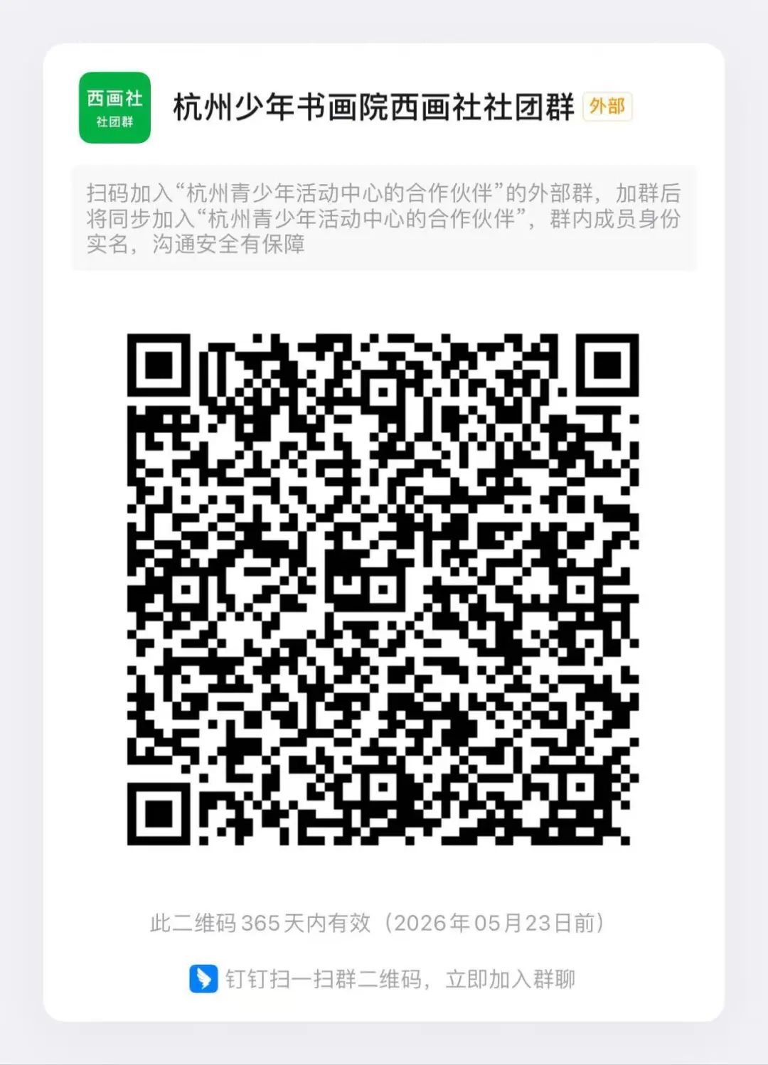 为了方便社团管理和通知社团活动,请新社员家长扫码进入我们少年书画院西画社钉钉群: