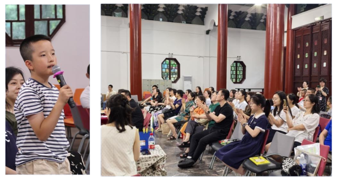 一联“崔巍青山浩然气,江水涛涛万古流”在结尾的“绿水青山共创诗”环节中,赢得评委们的一致好评,“三四年级的孩子已经在潜移默化中具备了创作近体诗的一定语感!”赛事评委杭州师范大学人文学院副教授、浙江省语言学会理事姜黎黎老师还为参赛选手讲解了从古体诗到近体诗的历史演变,拓展了同学们的诗词知识。