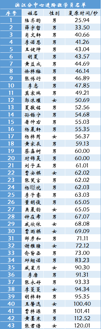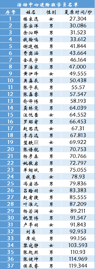 入选的成员将在暑期参加为期2周半的魔方课程集训(共12次课,每次90分钟),现结果已揭晓(名单见下文)。