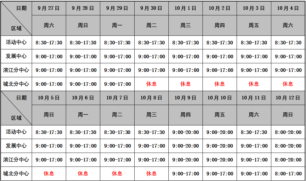 9月27日至10月12日中心各区域收费窗口开放时间安排