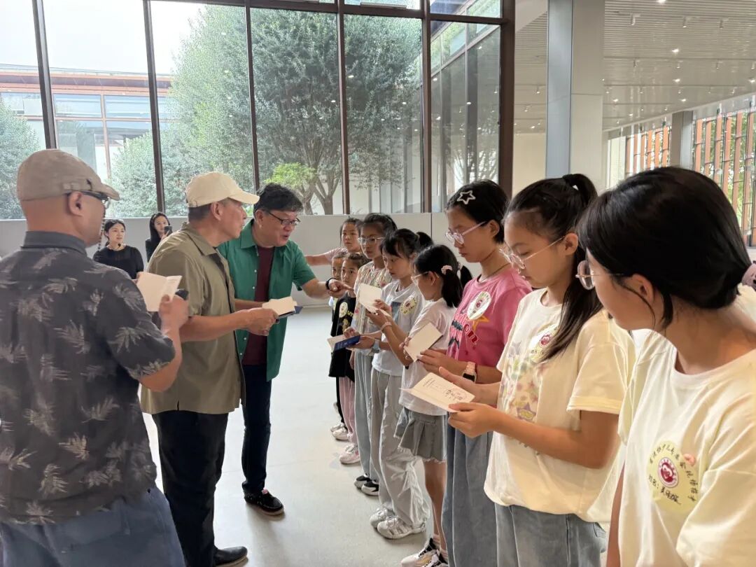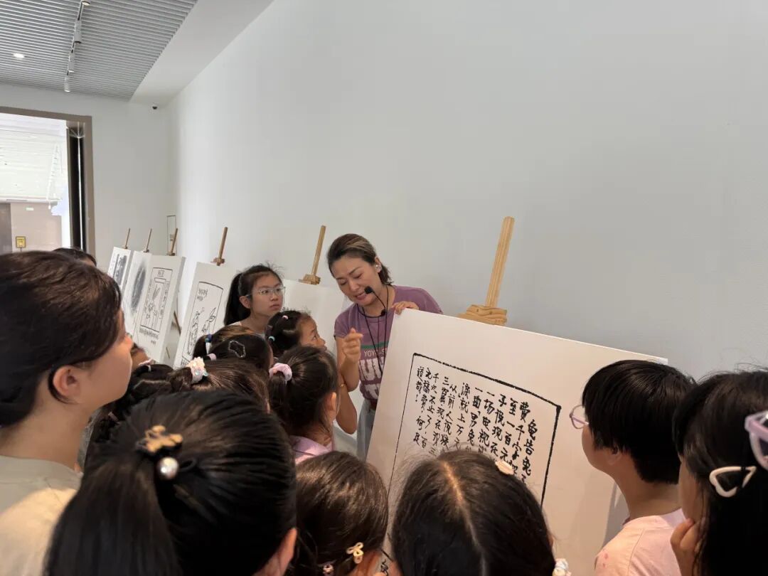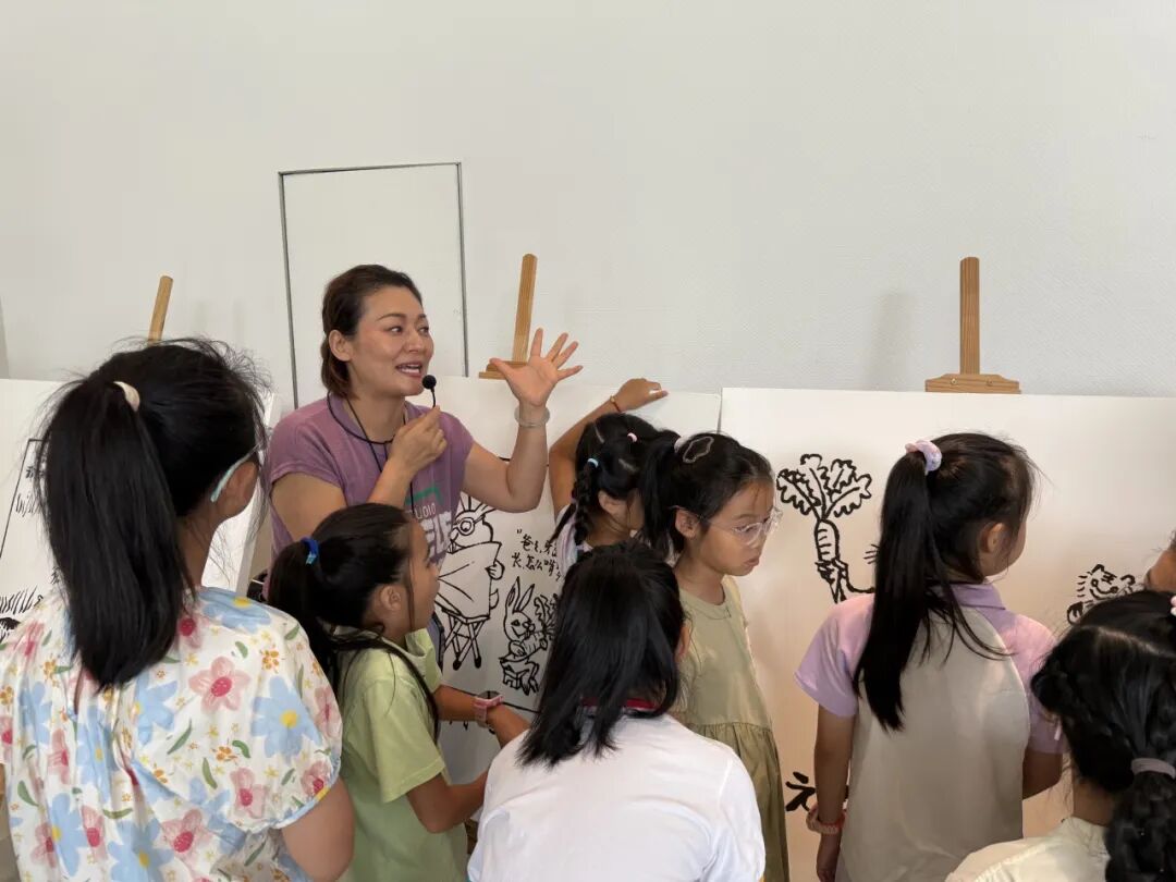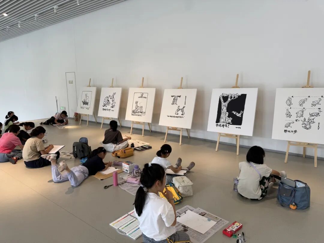 紧接着,王展老师为孩子们带来了一场关于华君武先生“笔底兔影 纸上华章”展的深度解读。今年是华君武先生诞辰110周年,他生肖属兔,一生创作了无数以兔为题材的妙趣漫画。王展老师生动地讲述着每一幅作品背后的故事,那些兔子不再是简单的绘画形象,而是被赋予了时代的情感与生活的烟火气。孩子们聚精会神地聆听,在华老的漫画世界里感受着幽默与智慧的魅力。