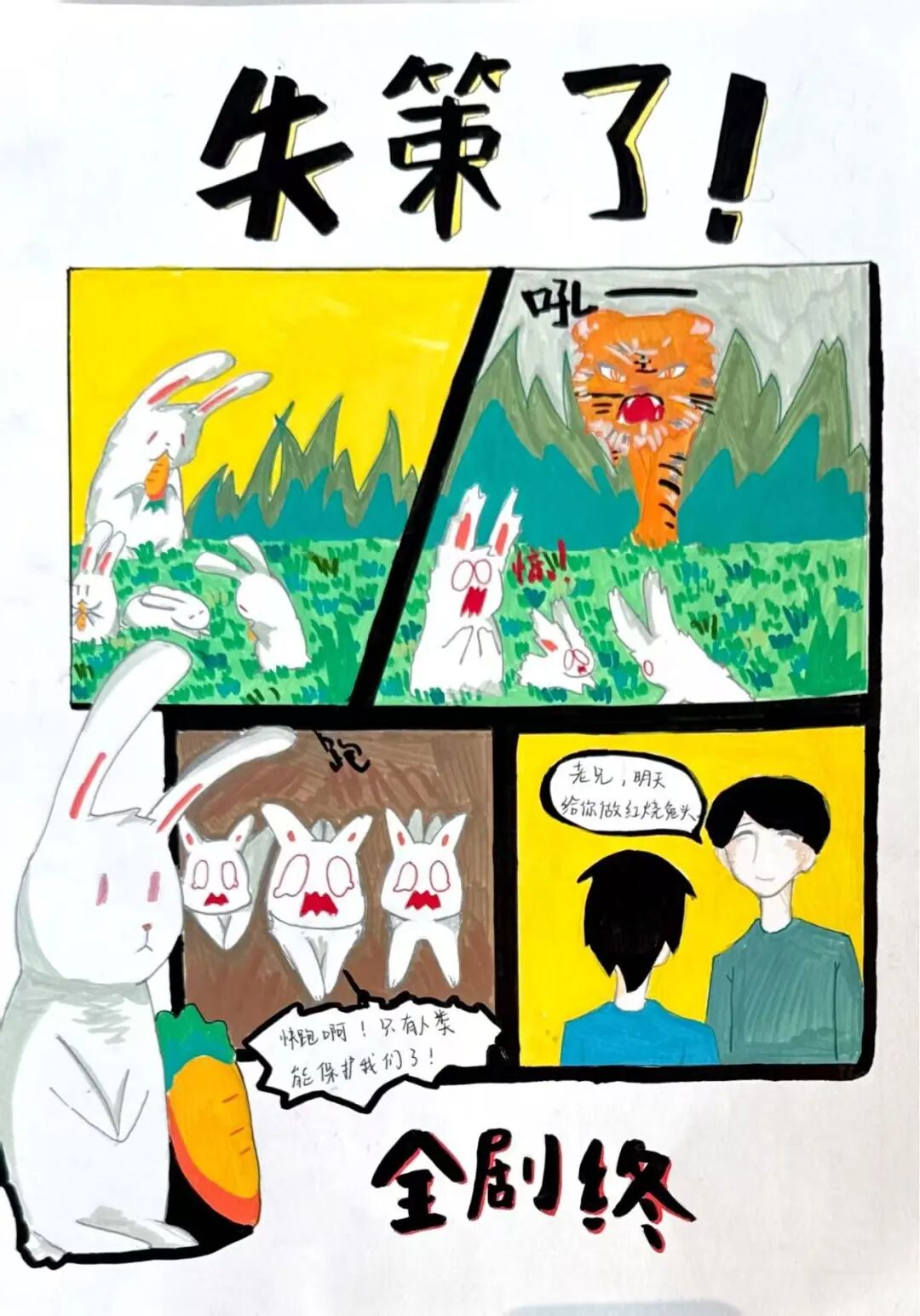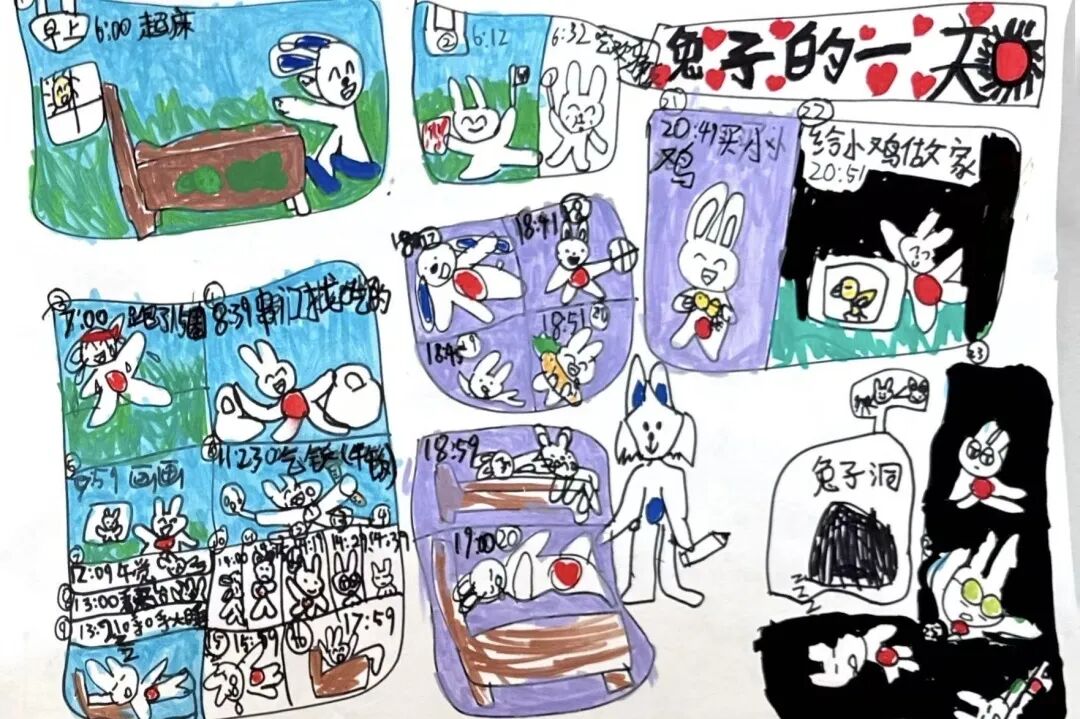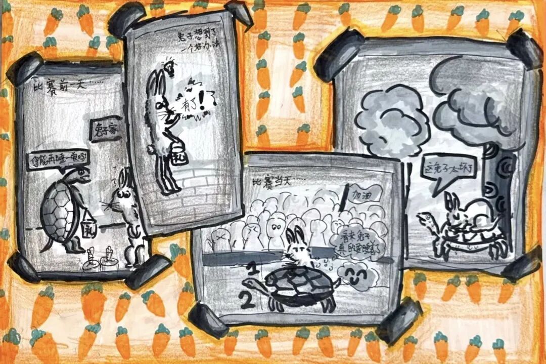 下午的考场,只听见画笔沙沙作响——最考验实力的四格漫画故事创编开始了!以华老的兔子为主题,孩子们需要构思一个完整的故事。