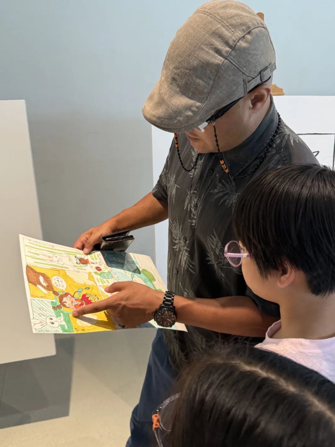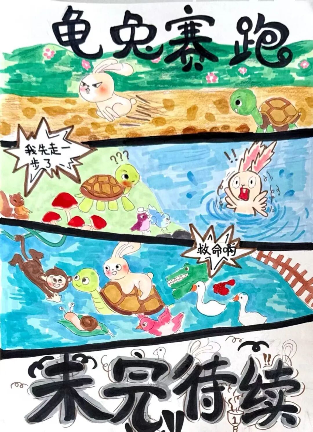 有的小画家抓耳挠腮,灵感忽隐忽现;有的则成竹在胸,下笔如有神。一个个奇思妙想的故事在画纸上诞生:有新编龟兔赛跑,有时尚的都市兔子,有穿越到古代的兔子......他们将上午的所见所闻、所感所想,都融入到了这小小的四格漫画中,用自己独特的视角和绘画风格,诠释对华老作品的理解和对漫画的热爱。