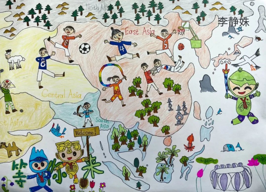 少先队员们发挥创意,用色彩表现运动的活力,用文字展现亚洲文化的多样性。